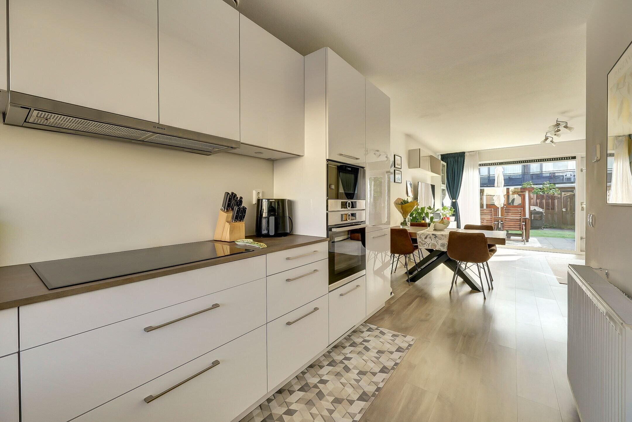 De keuken is werkelijk een eyecatcher: nagenoeg nieuw, luxe uitgevoerd en voorzien van alle denkbare inbouwapparatuur. De moderne indeling en hoogwaardige materialen maken dit de perfecte plek voor wie graag kookt in stijl.