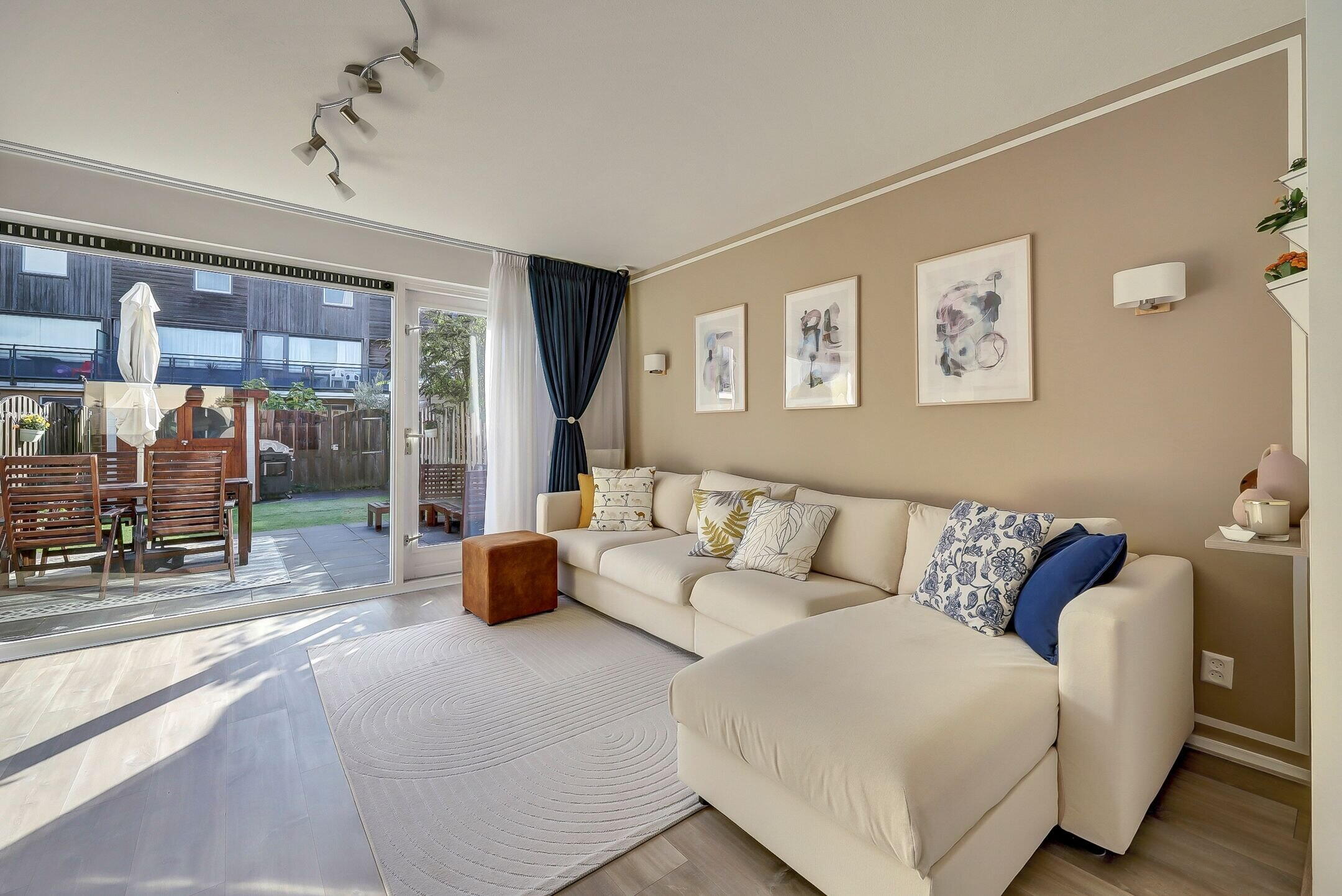 De woonkamer is licht, strak afgewerkt en geeft een heerlijk gevoel van ruimte. Grote ramen laten veel daglicht binnen en bieden toegang tot de prachtige, op het zuidwesten gelegen tuin. Hier kun je de hele dag van de zon genieten, gezellig eten met vrienden of gewoon ontspannen in je eigen groene oase.