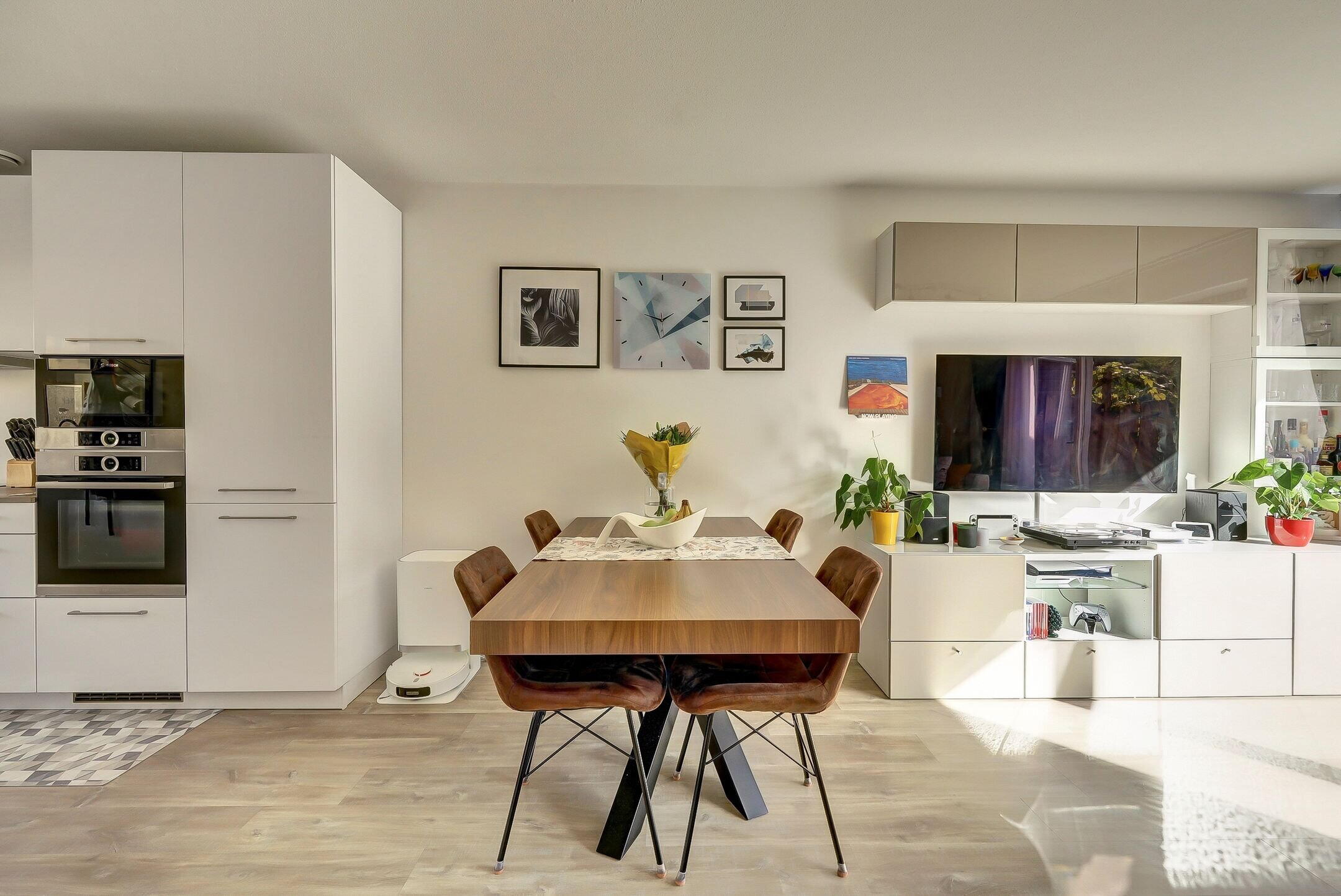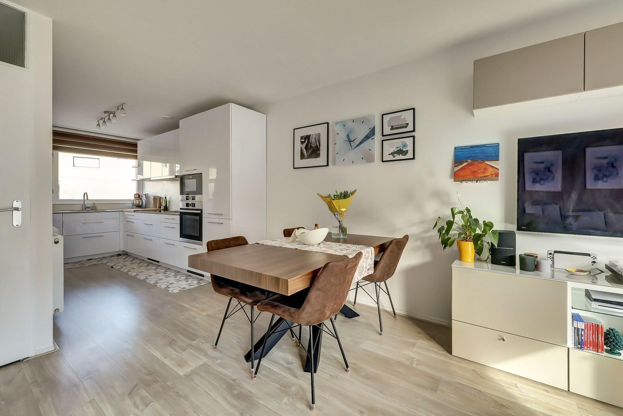 The living room is bright, elegantly finished, and offers a wonderful sense of space. Large windows let in plenty of natural light and provide access to the stunning southwest-facing garden. Here you can enjoy the sun all day long, dine with friends, or simply relax in your own green oasis.